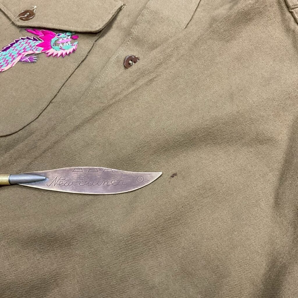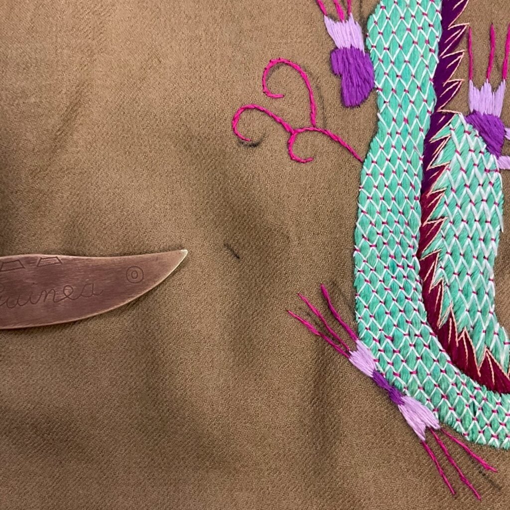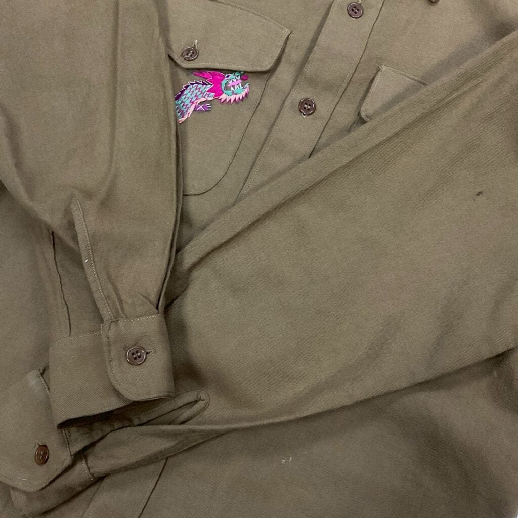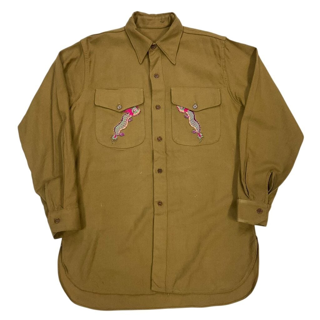 カラフルでヘタウマなドラゴン刺繍が映えるスカシャツ。