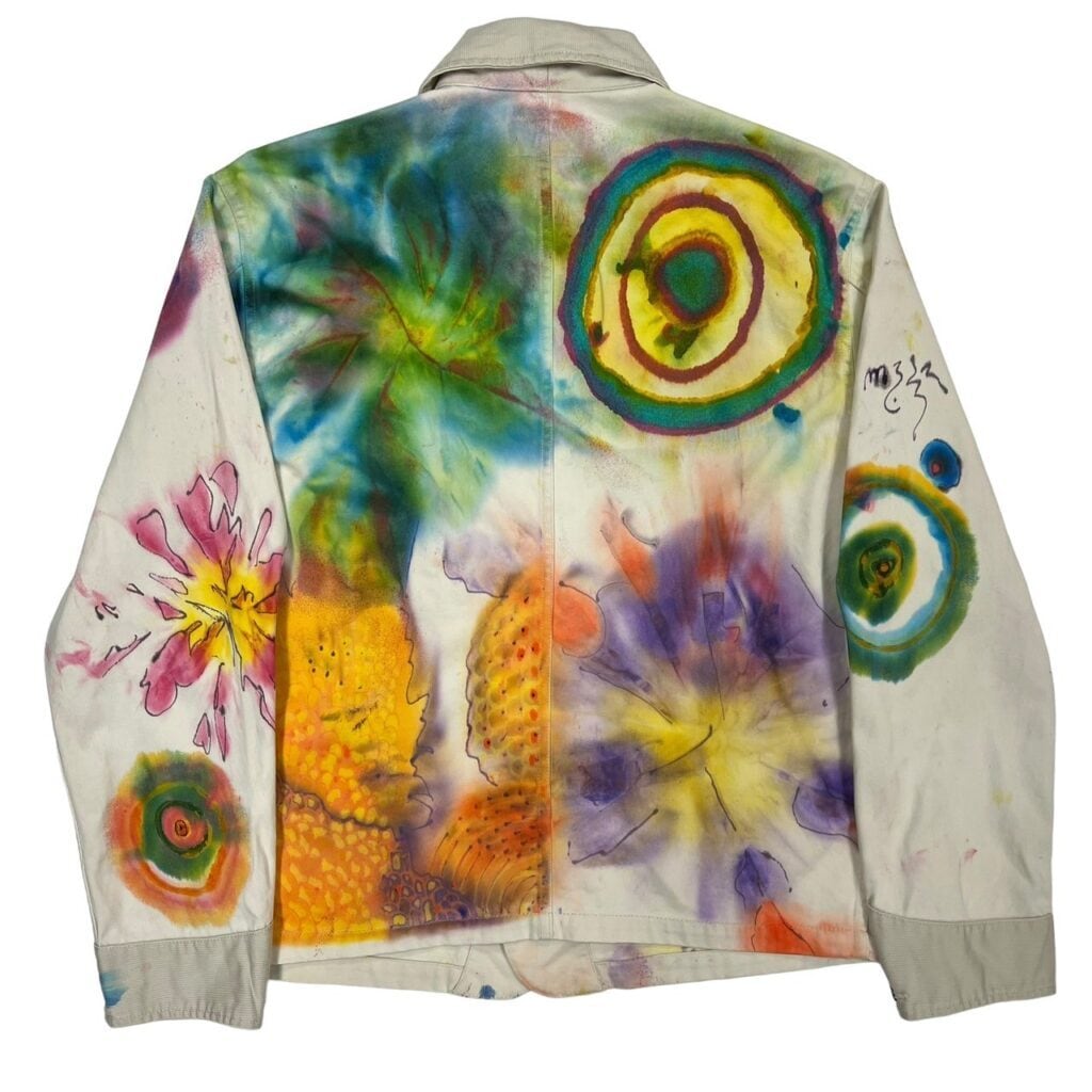 白の三つポケカバーオールにアートが施された