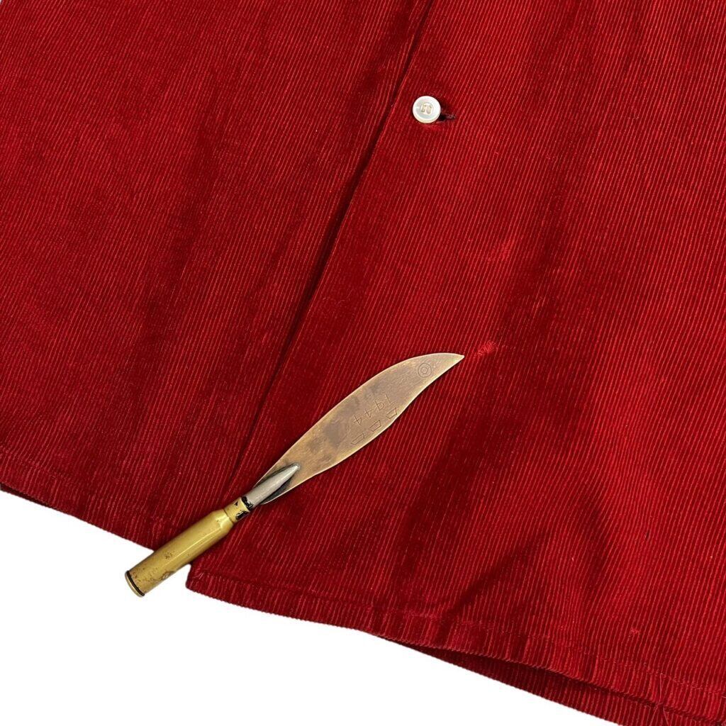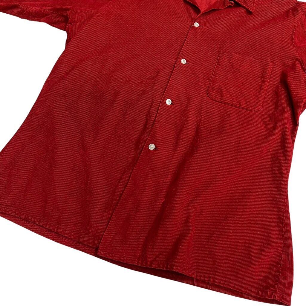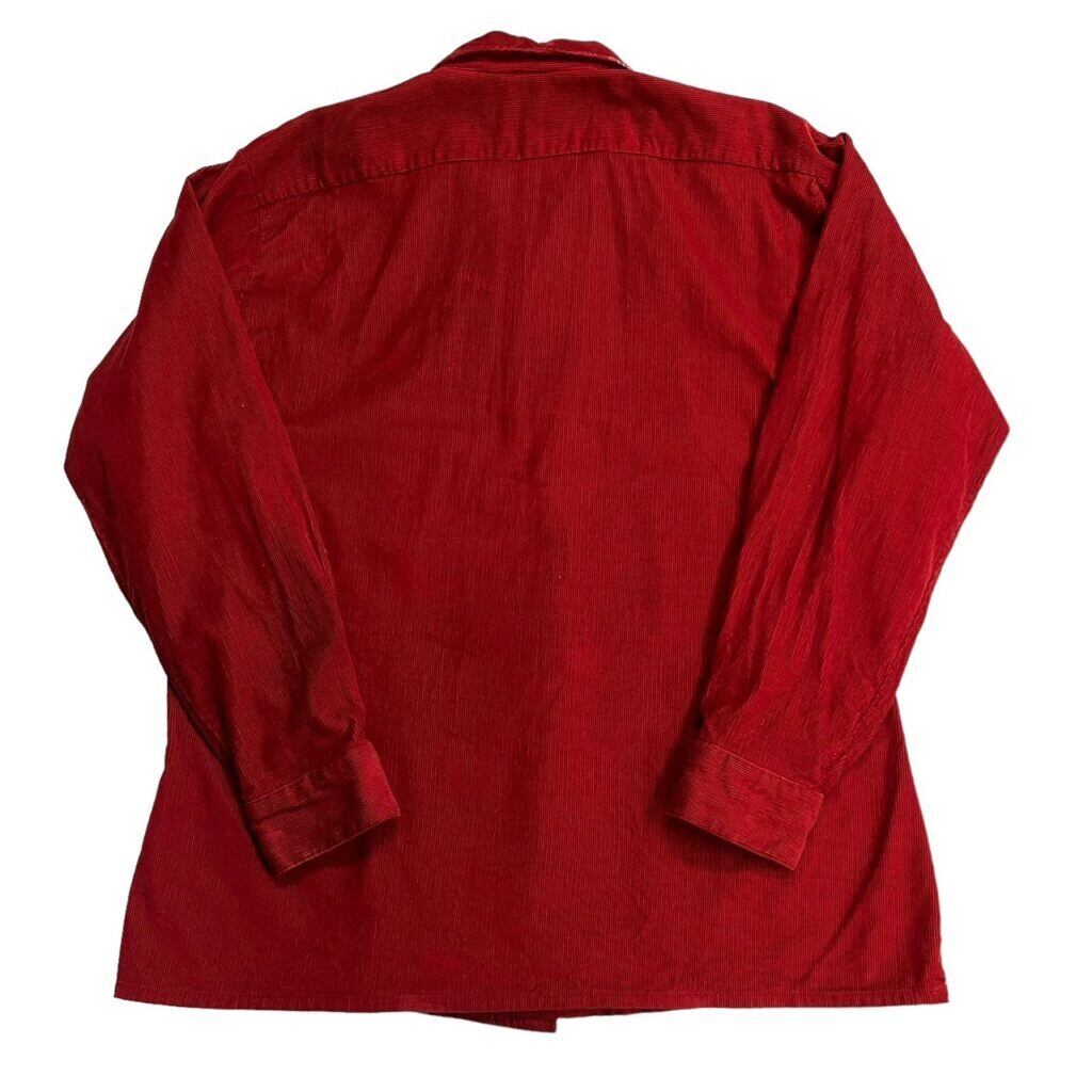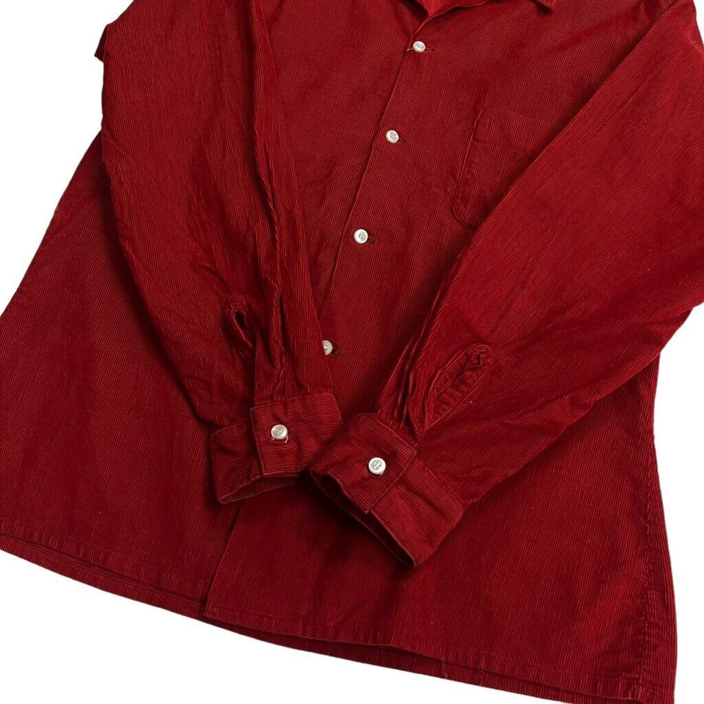 不良カラー赤のコーデュロイオープンカラーシャツ。